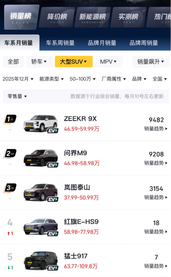 对于高净值人群而言,用车需求往往是多元化的。他们既需要车辆在商务场合彰显体面,也要求它能满足家庭出行的舒适与便利,偶尔还可能渴望去探索更广阔的自然天地。从上面的对比可以看出,问界M9在科技与商务融合上深度聚焦,理想 L9在家庭实用性上特色鲜明。而极氪9X则在于其"没有明显短板"的均衡实力,能够更精准地覆盖高端消费者多元化的核心诉求。市场表现也印证了这一点。2025年11月,极氪9X以8121辆的销量登顶50万级以上大型SUV市场销冠。进入12月,极氪9X继续高歌猛进,单月交付高达9482台,创下该车型上市以来单月交付新高,超越问界M9的9208辆,再次夺得销冠名号。连续两个月的优异表现,充分证明了极氪9X在高端市场的强劲竞争力。