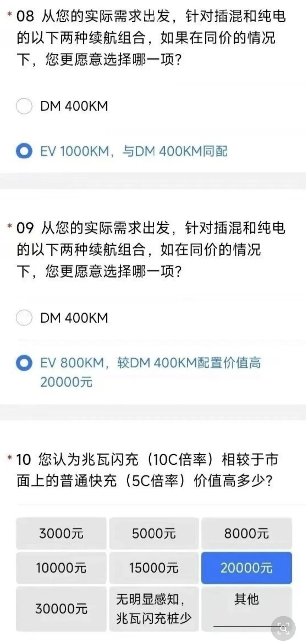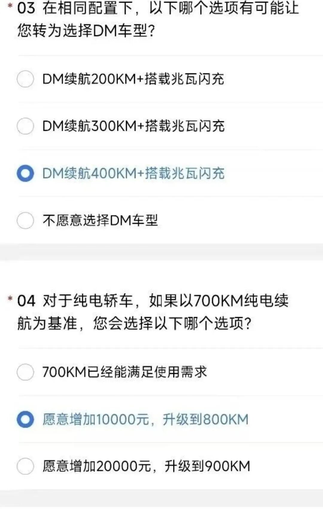 在这次调查问卷中,有几道题还是很有针对性的,对于混动车型,很多人都选择了,DM续航400km加上兆瓦闪充,实际上,对于比亚迪的DM车型来说,纯电续航已经没有多大的优势了,友商给到的纯电续航都要高,如果真给到400km的纯电续航,那么就真的无敌了。