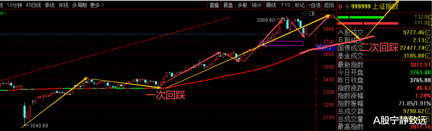 短期来看周四几大指数回踩60分钟55或者90分钟55,这也是自6月23号以来第二次回踩,理论上是由机会再次挑战前高的,也就是6月23号以来的上涨还不能判定结束,下周还有机会新高。等这一波上涨结束,6月23日以来的上涨才有望结束。然后开启二次回踩55天均线的过程,继续震荡。3040以来的上涨第一次回踩55天均线就是6月23日,下周冲高后二次回踩,回踩到位还会走3040以来的5浪,这样3040以来的主升3浪上涨才结束,时间还早,到时看能不能挑战一下4400附近。3040上涨结束,预计会再次回踩年线(二次回踩,第一次在4月7日),再走大5浪,然后牛市结束。