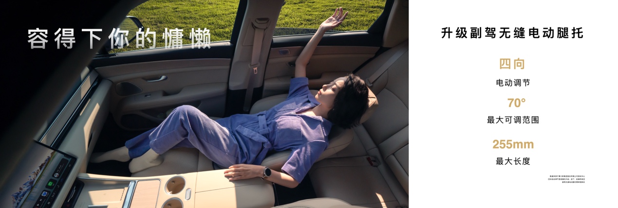问界新M5 Ultra副驾升级无缝四向电动腿托,最大角度可达70°,最大长度255mm,搭配可调色温化妆镜。全系标配舒云座椅,采用10层舒适性叠层设计,前排具备通风、加热、按摩功能,后排配备双HUAWEI Maglink®,支持多设备联动。