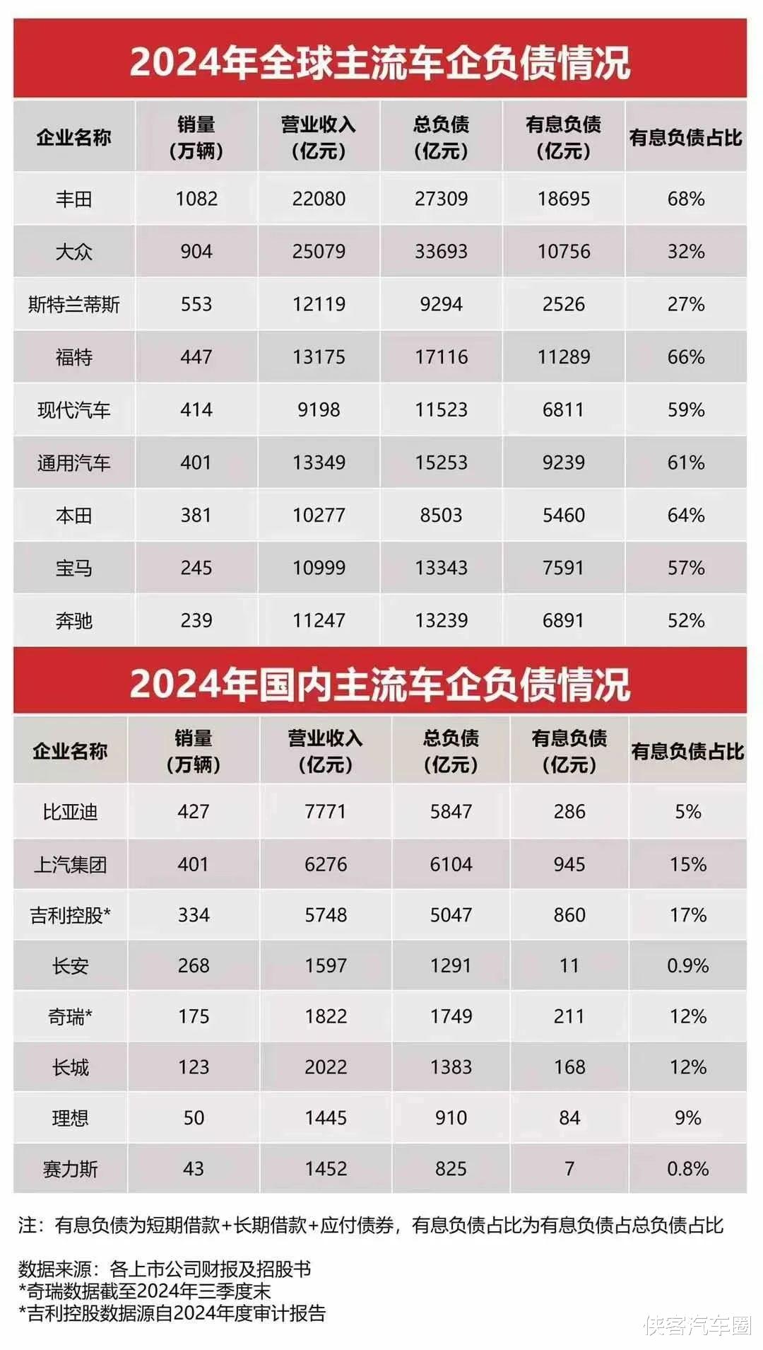 2、拿我们总负债5800多亿说事,很危险!那丰田2.7万亿、大众3.4万亿、福特1.7万亿、吉利5047亿、上汽6104亿,他们危险吗?(图2:2024年上市公司财报信息一负债情况)