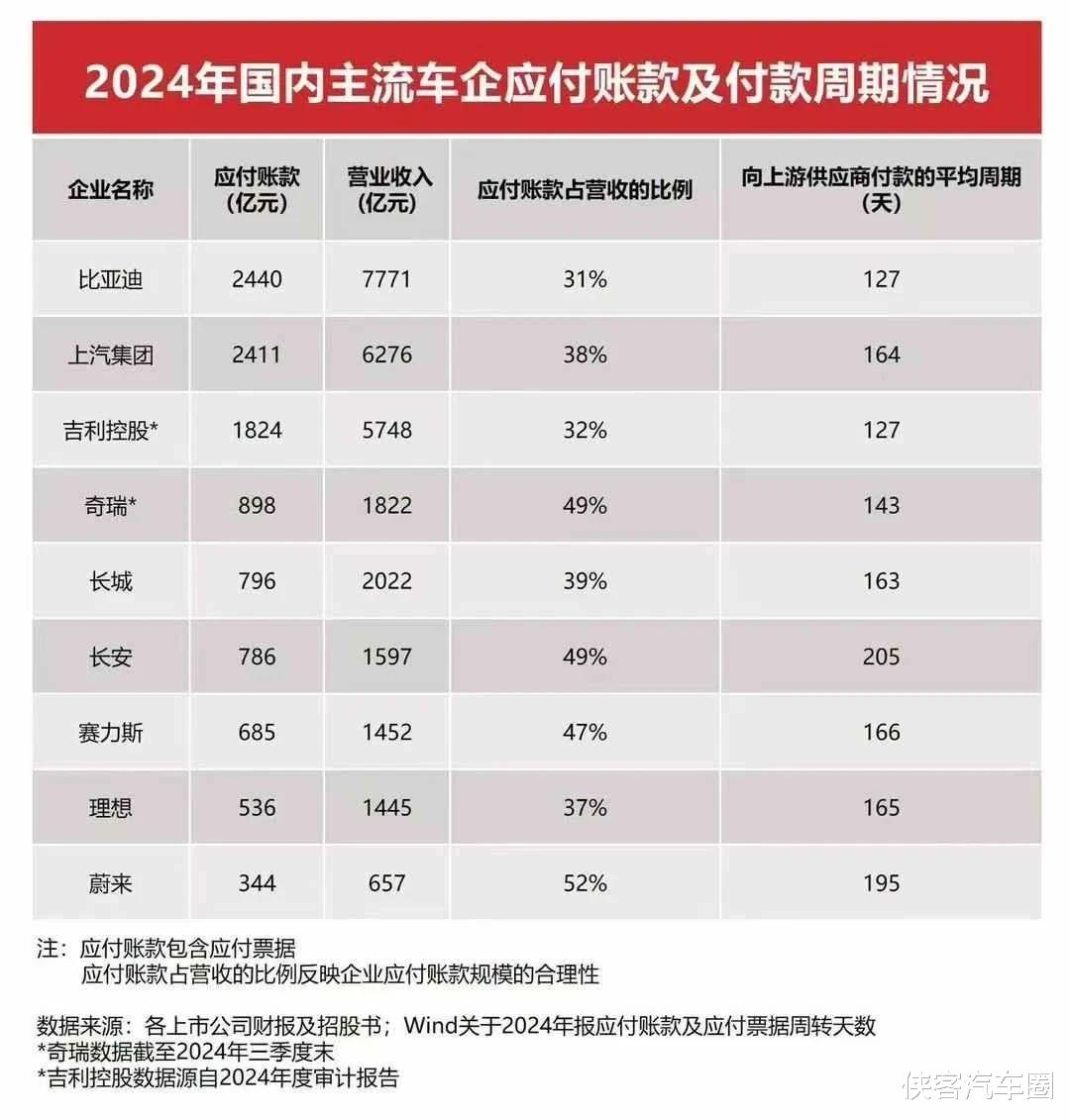 4、你们又带节奏说,我们的负债主要是供应商应付款。其实一个企业的规模越大、营业收入越高,对外采购与合作的体量也越大,对拉动经济增长的作用也更明显。我们是2440亿、上汽是2411亿、吉利是1824亿。其实一个企业应付账款多不多,还要看应付账款占营业收入的比例,这个比例越低,说明未支付的货款比例越小。我们是31%、吉利是32%、上汽是38%、长城是39%。(图3:2024年上市公司财报信息一应付账款及付款周期情况)