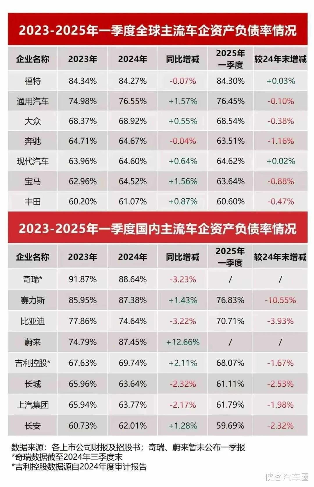 这一切源于上周长城汽车魏总的惊人言论:"现在汽车产业里边的“恒大"已经存在了,只不过没爆而已"。在这里,我想对一些恶意带节奏的有关势力(发起方、黑媒及水评)公开问几个问题:1、说我们70%的资产负债率高,很危险!那福特84%、通用汽车76%、苹果80%、波音102%、吉利68%、赛力斯76%,他们高吗?危险吗?(图1:2023-2025年一季度上市公司财报信息-资产负债率情况)