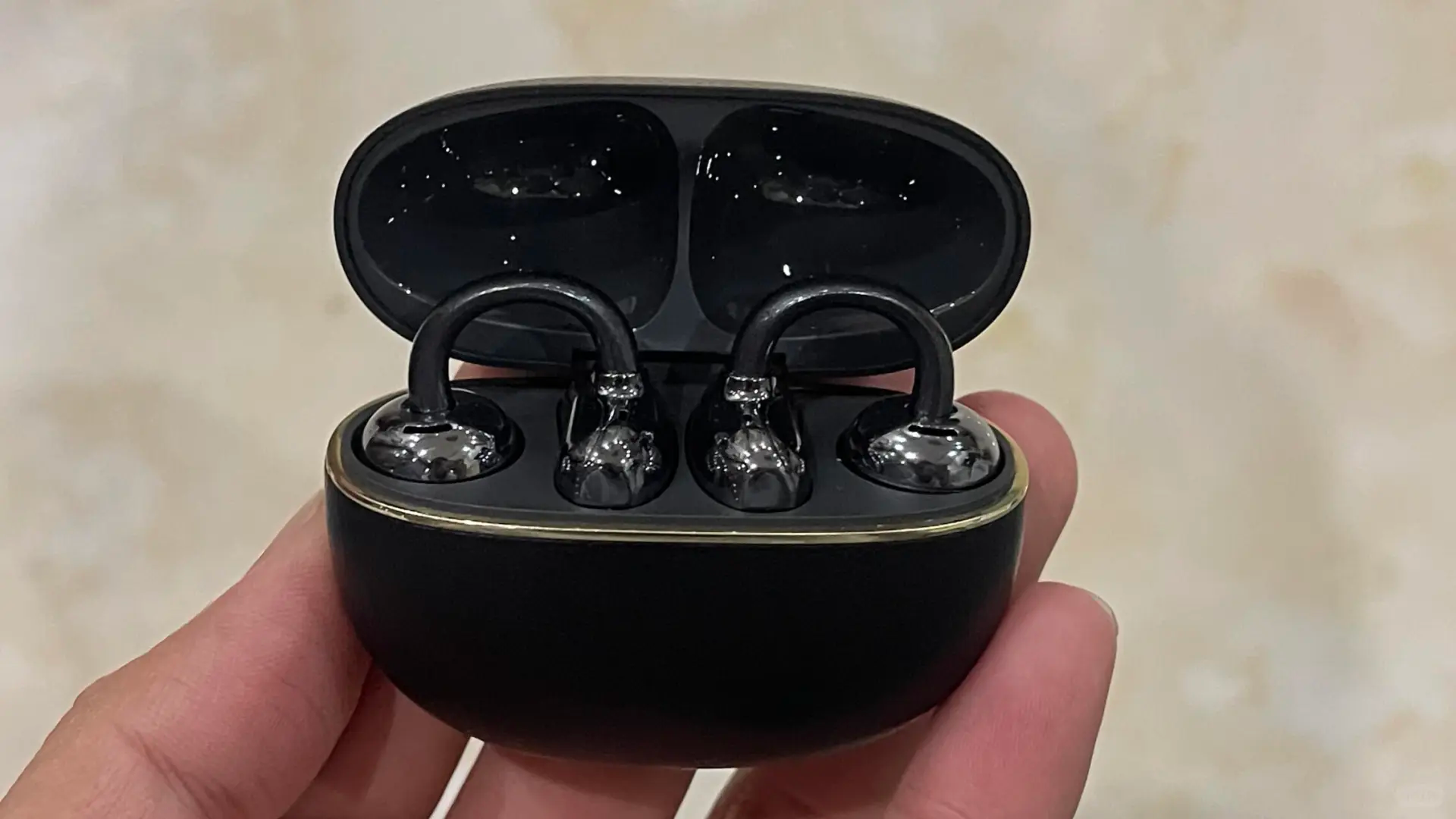 JBL琉璃扣的半透明耳机盒设计极具辨识度,内部结构清晰可见,科技感与时尚感兼具。耳机采用C形弹性桥结构,外部包裹柔性TPU材质,佩戴稳定性不错,但由于单耳重量偏大,长时间佩戴会有一定夹耳感,更适合短时使用。