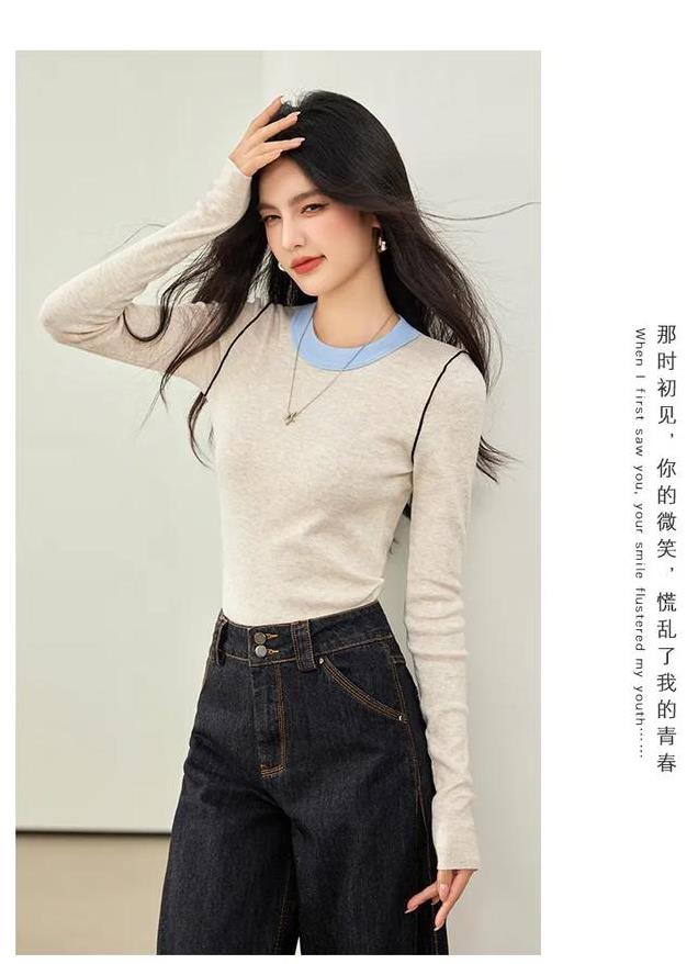 材质柔软顺滑,贴身穿超级舒服,而且还很显瘦哦!撞色圆领的设计,时尚感爆棚,让你瞬间脱颖而出。长袖的款式,保暖又实用,无论是搭配外套还是单穿,都能轻松打造出不同的风格。