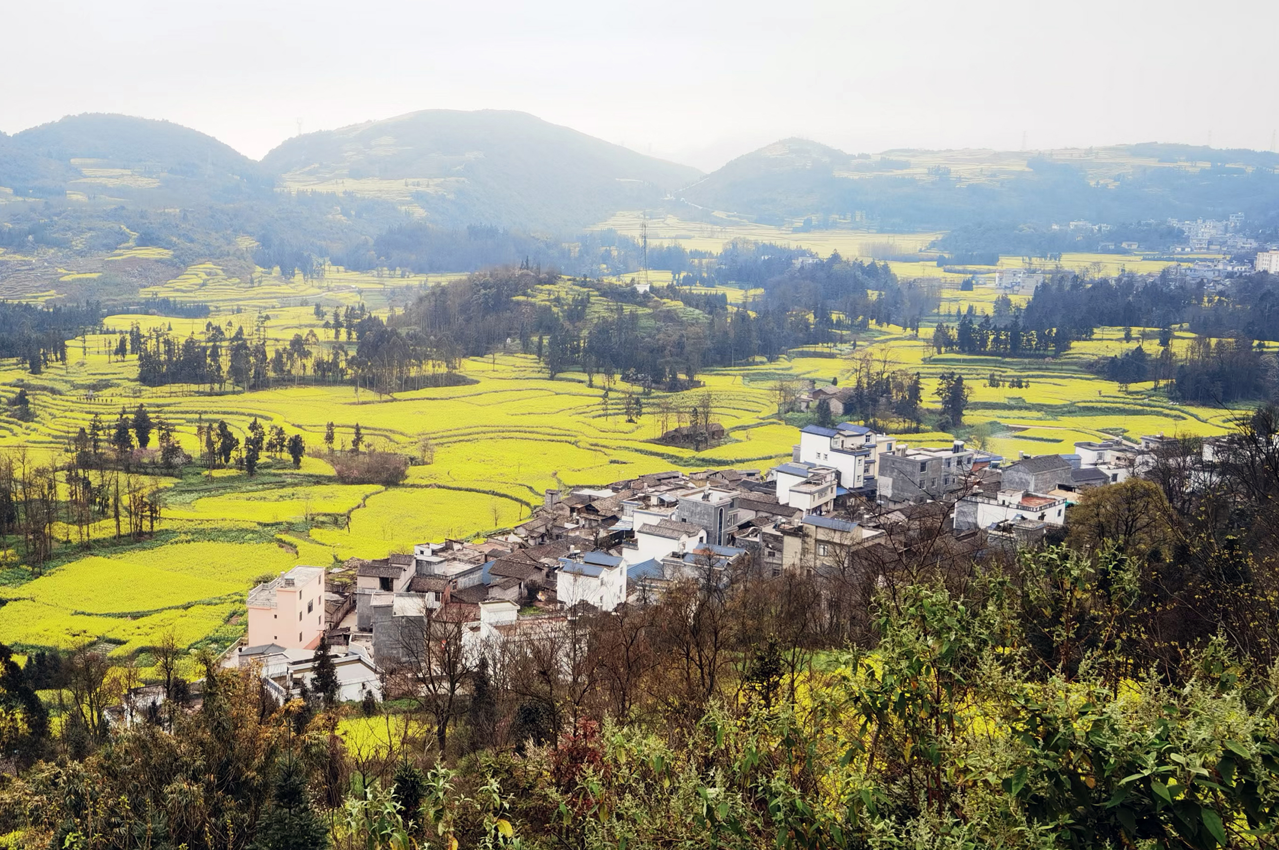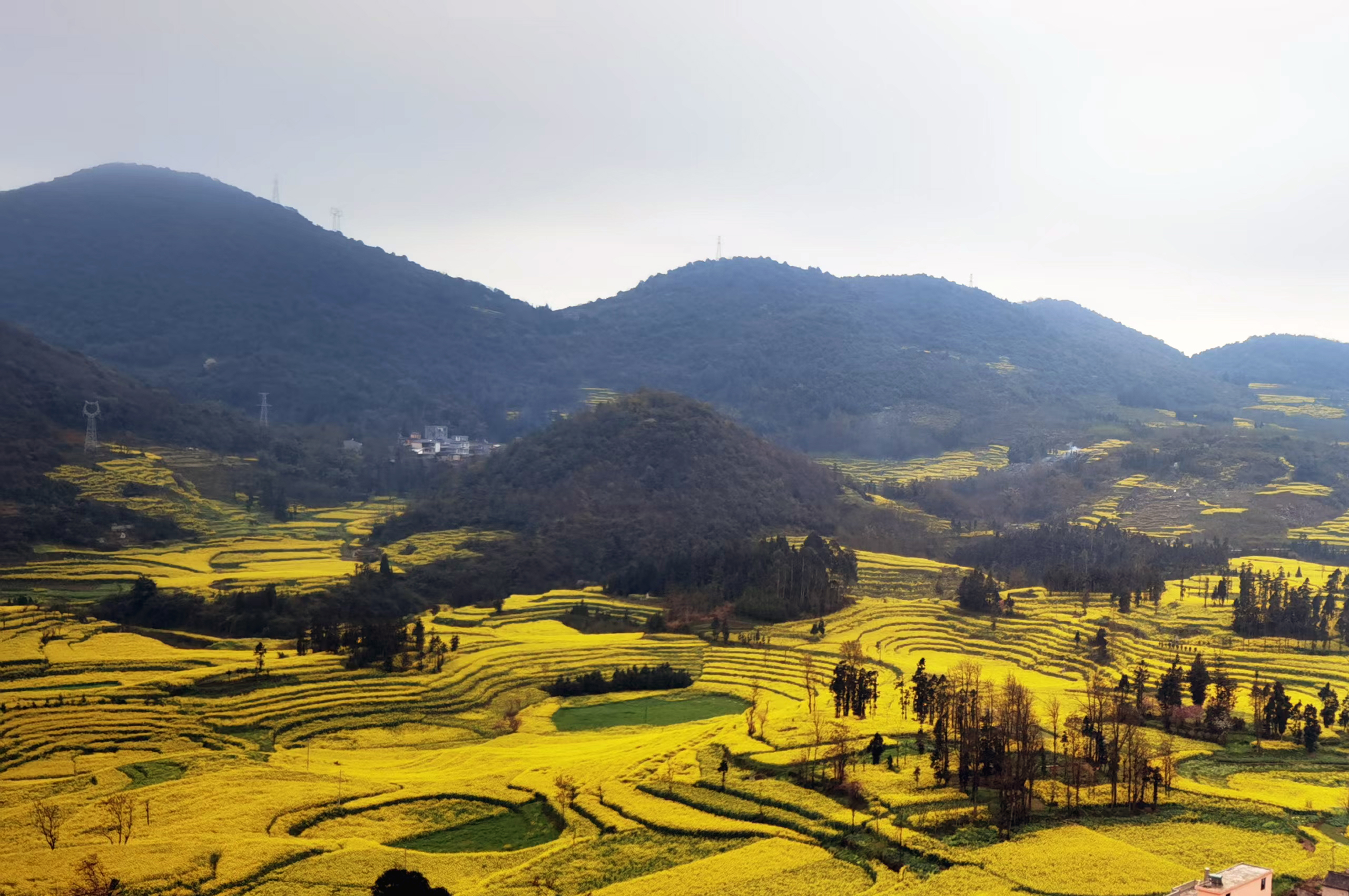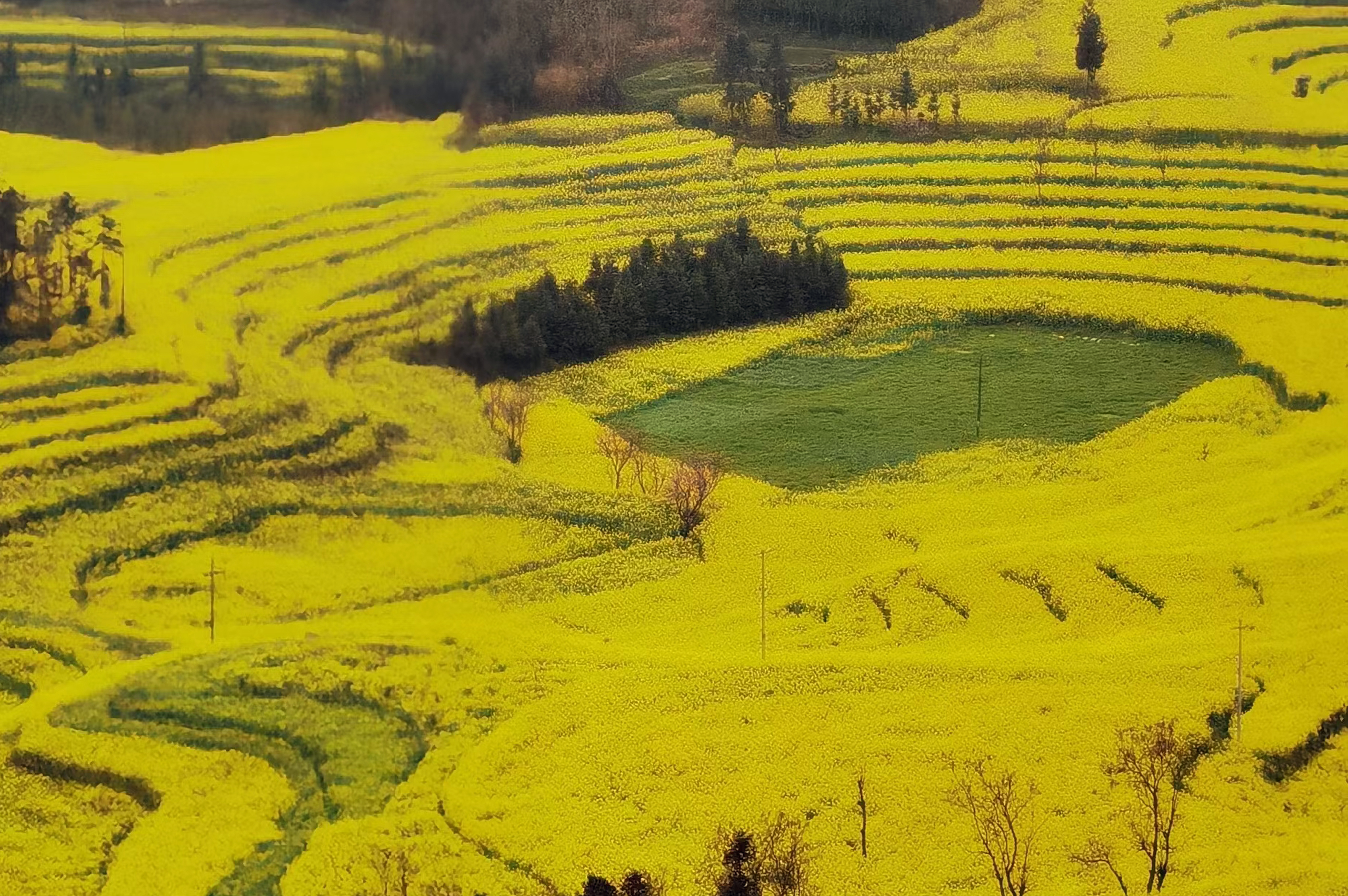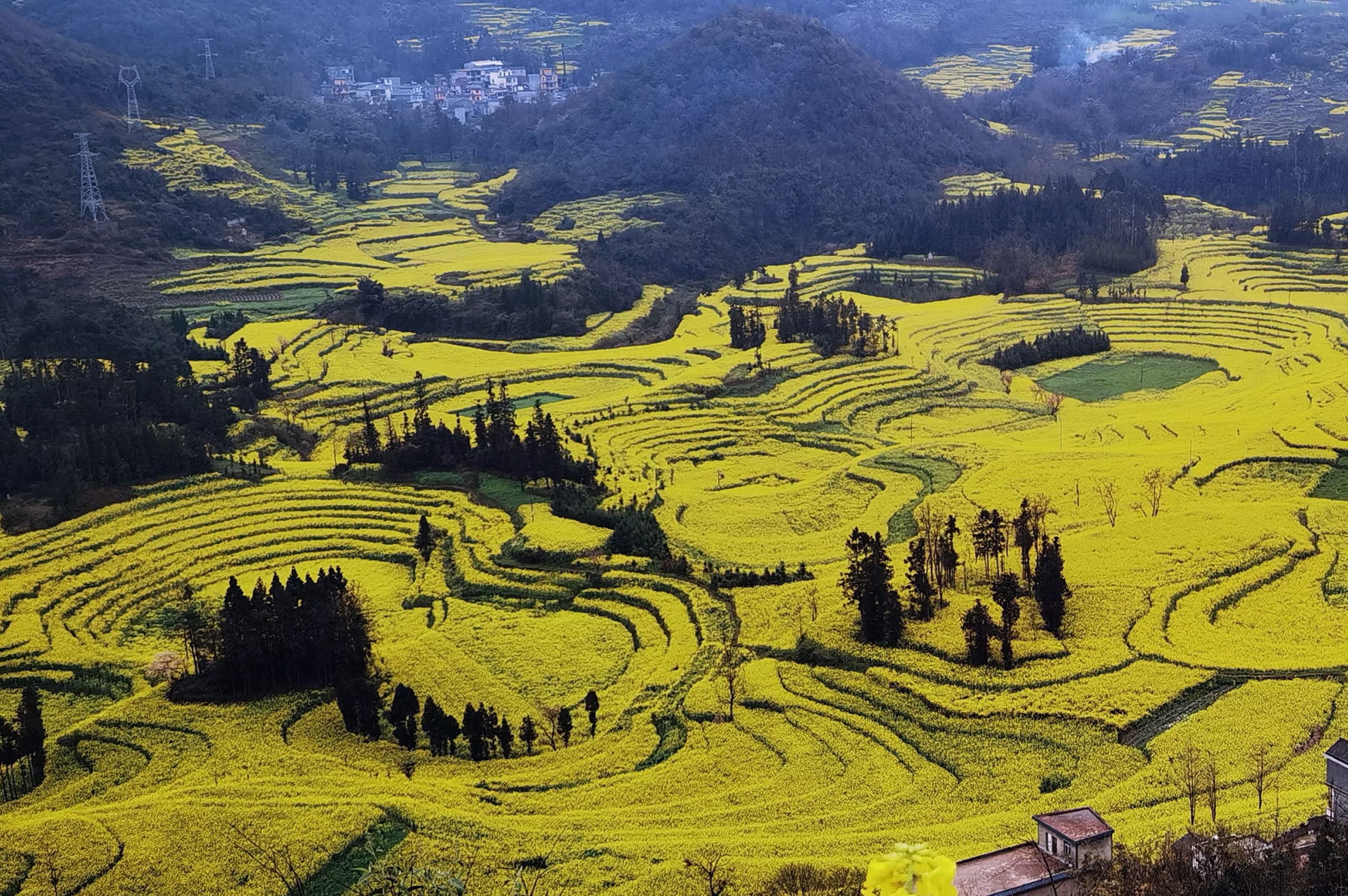 站在高处,就能将螺丝田景区的油菜花一览无遗,尽收眼底。远远看去,梯田还真像螺丝上的螺纹,有模有样。有成片的菜花,有成行的绿树,有成排的房屋,其线条错落有致,色彩鲜明,形状优美,美不胜收。