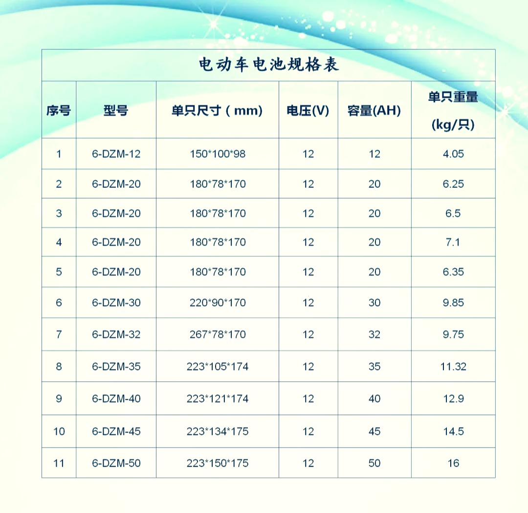 电动车使用的铅酸电池常见容量有12AH,长151mm、宽99mm、高97mm,市面上所谓的14AH、16AH,是普通铅酸蓄电池的升级版本所谓的石墨烯电池,其长宽高与12AH电池一样,只是重量略有增加。