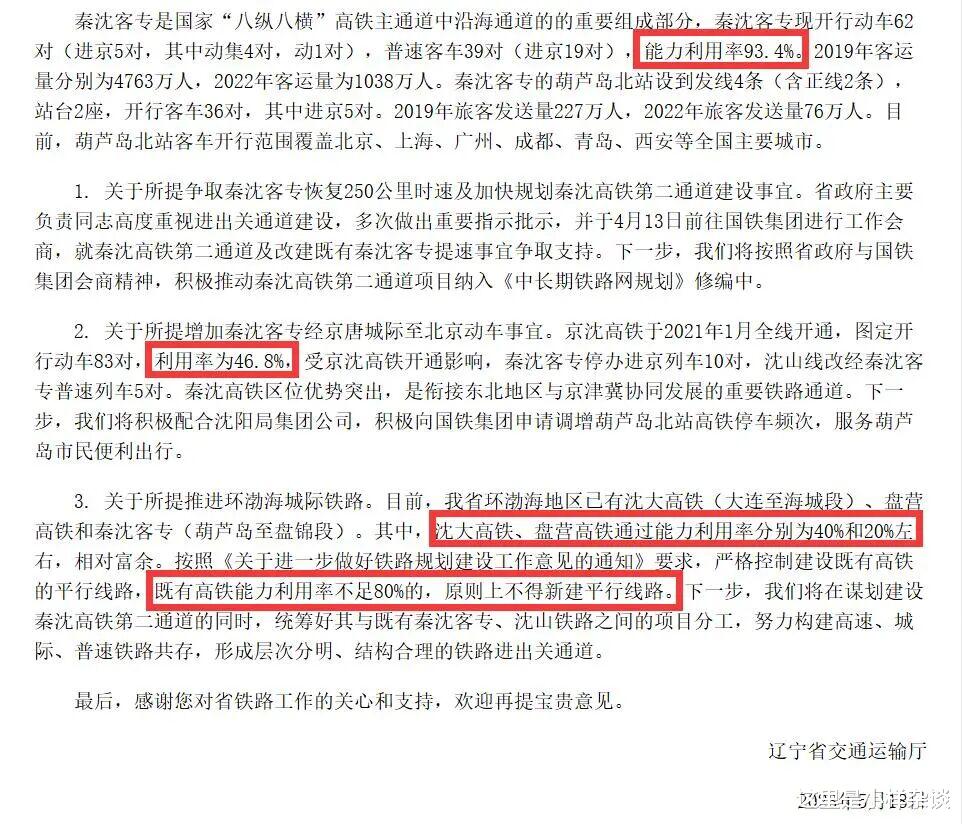 (图片来源于辽宁发布公众号截图)这是关于少有的关于秦沈高铁二通道的官方说法,之前只有丹东政协官方公众号提到了参考秦沈二通道高铁的审批经验,建立“绿色通道”,压缩审批周期。为什么很多人人关注这条线路呢,就是因为现在连接东北和华北的高速铁路只有京沈高铁和秦沈客专,前者就是个断头路,想连接全网高速铁路网的路一直不通,后者是中国第一条试验性高铁,标准非常落后,速度非常慢。所以这些年一直期待建设新的秦沈高铁,但是之前国铁方面认为秦沈高铁二通道和京沈高铁是并行线路,而京沈高铁利用率不达标(80%),所以不能建设,这些年关于秦沈高铁二通道和京沈高铁是不是并行线,秦沈客专利用率的话题不断,在大家的印象中秦沈客专是非常繁忙的.辽宁省交通运输厅在回复代表的信件中提到了这个数据,2023年的时候,秦沈客专利用率93.4%,京沈高铁利用率46.8%。