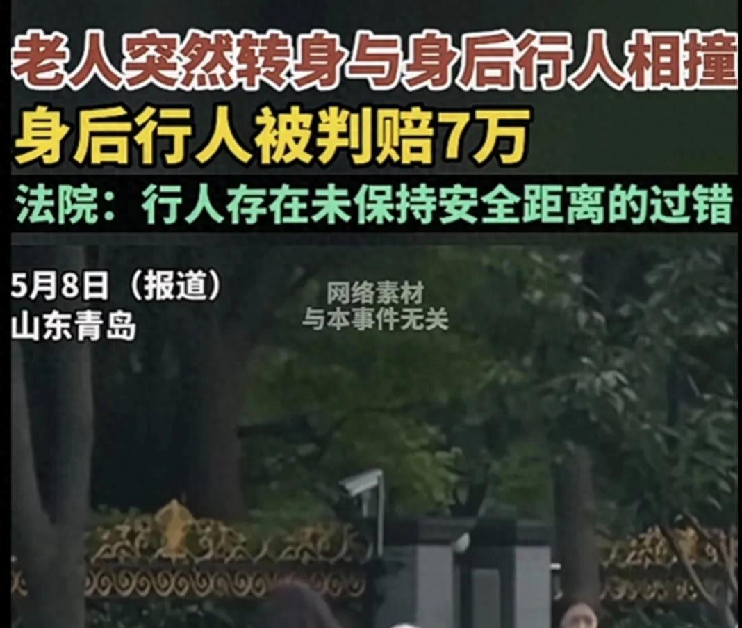 事情经过是一位老人在前面边走边打电话,中途突然转身往回走,与迎面而来的人撞在一起,老人当场倒地。经过监控调取,法官表示,老人虽然受伤,但是前方没有突发情况下突然往回走存在较大过错,而后面的行人因为没有保持安全距离负次要责任,经过多次调解,身后行人被判7万元。