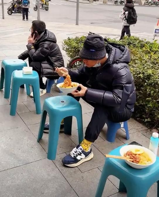 而任重直接在路边的凳子上吃饭,毫无包袱。