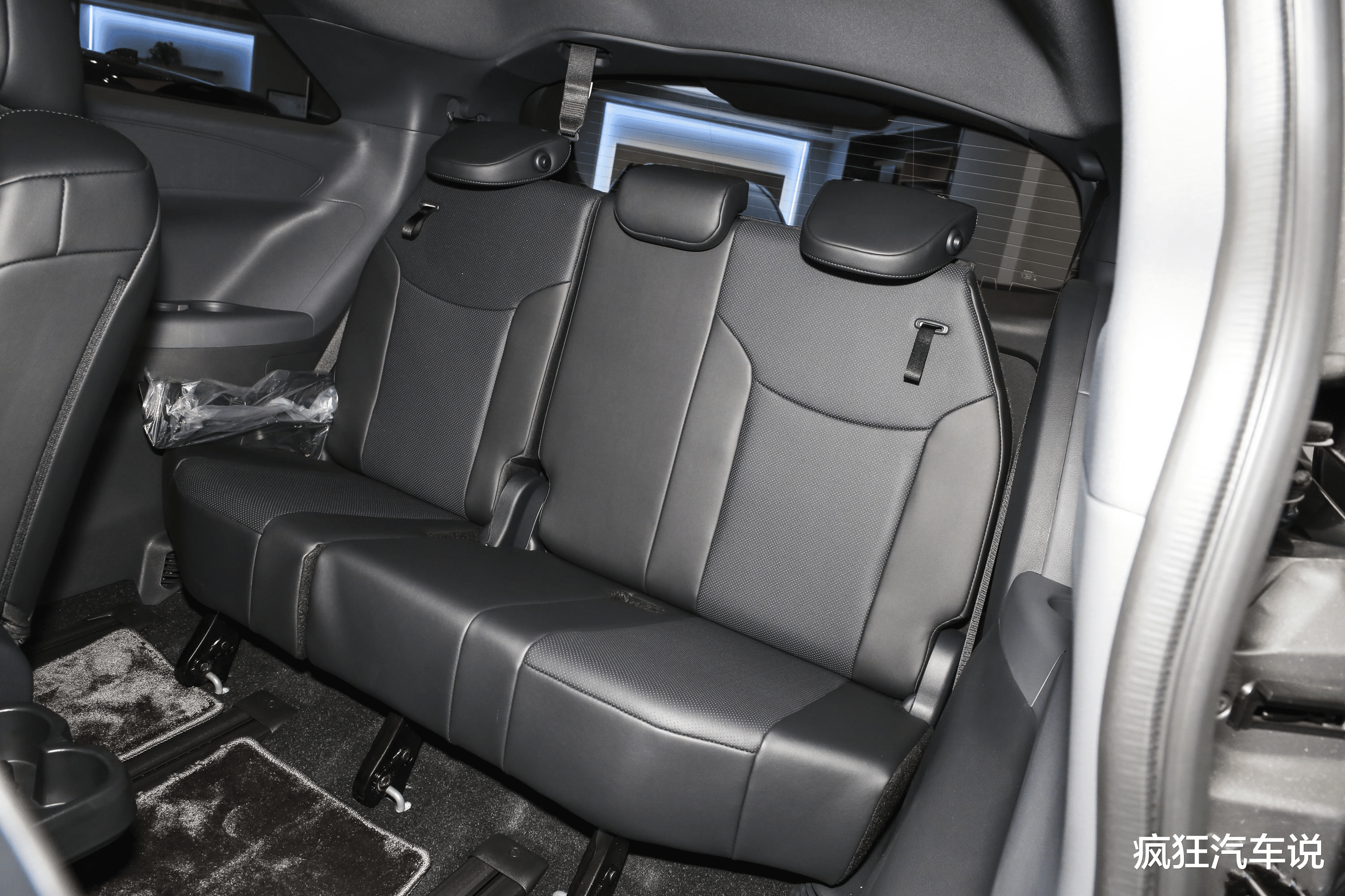 第二排是赛那的重点打造区域,但入门车型配置一般,配备了两张独立的航空级座椅,材质为织物制作,只具备前后靠背角度调节,而高配车型座椅材质为真皮和仿皮混搭,还配备了电动调节、加热、通风、按摩等功能,长时间乘坐也不会腰酸背痛,妥妥的“老板座”待遇。而且第三排座椅支持放平,放平后地板几乎没有落差,并且后备箱形成一个几乎全平的空间,容积从常规状态下的521L拓展至2112L。这空间别说装行李了,当个“床车”都绰绰有余。此外,全车都采用了隔音玻璃,即使在高速行驶时也能让乘客享受宁静舒适的环境。