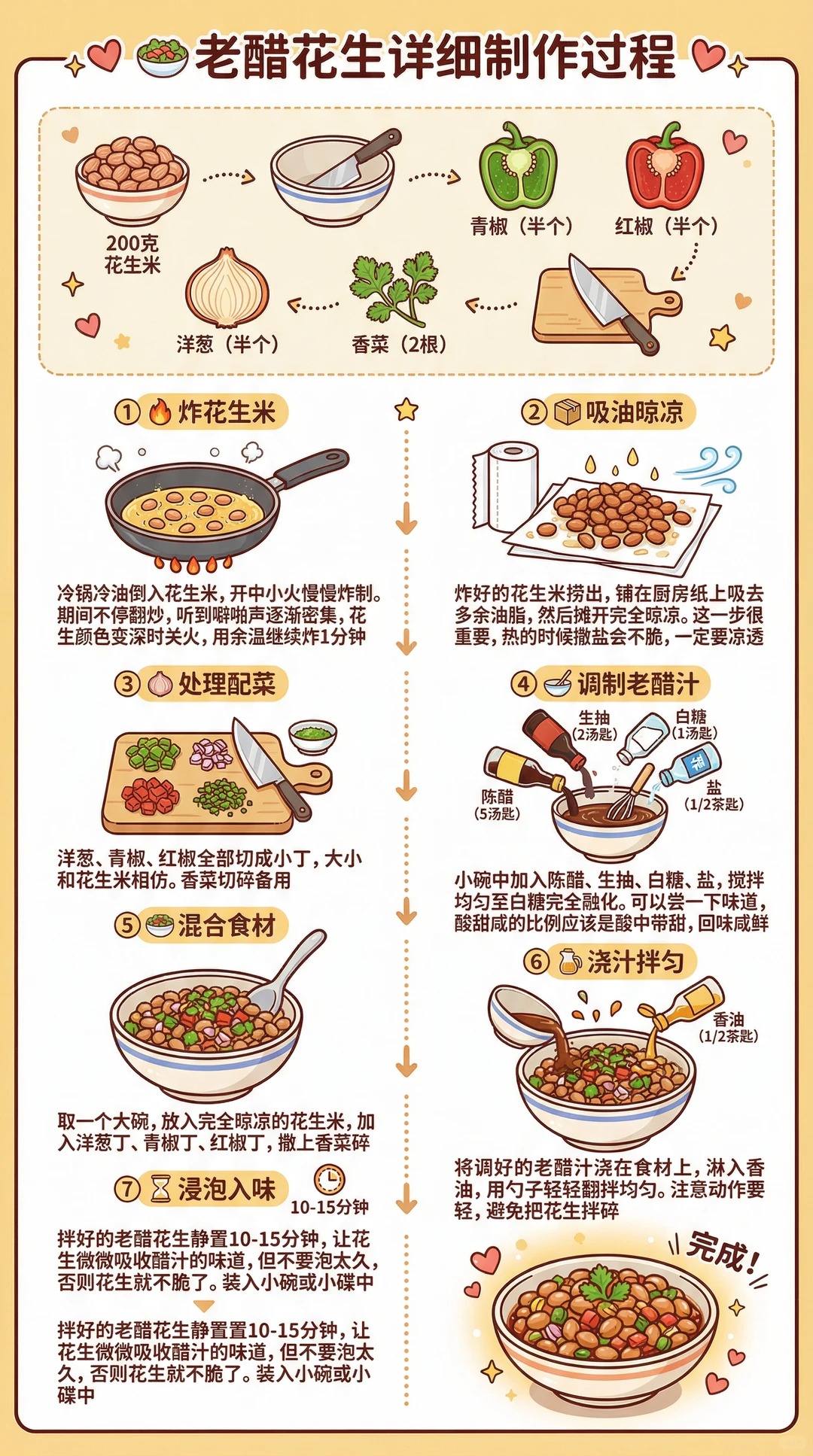 调料:陈醋4汤匙🍶,一定要用陈醋,年份越久味道越醇厚;生抽1汤匙🥫,白糖2汤匙🍬,盐少许🧂,香油1茶匙,食用油适量(炸花生用)。