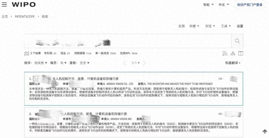 值得关注的是,其中一项专利“无人机控制方法、装置、计算机设备和存储介质”(以下简称“该项专利”)同时申请了国内、国际专利。WIPO官网显示,其国际专利的资料中公布了所有发明人信息,但在中国的申请文本里对第一发明人李某某进行了不公布处理。而在国家知识产权局检索可以发现,在大疆2019年至2022年申请的多项无人机相关专利资料中,李某某也作为发明人之一出现。