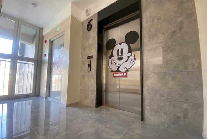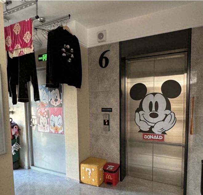 从电梯上来,整个空间贴砖刷墙已经布置完成,这位姑娘也只是在电梯门和旁边的应急通道门上贴了米奇的卡通贴纸,并没有做太多其他改动。