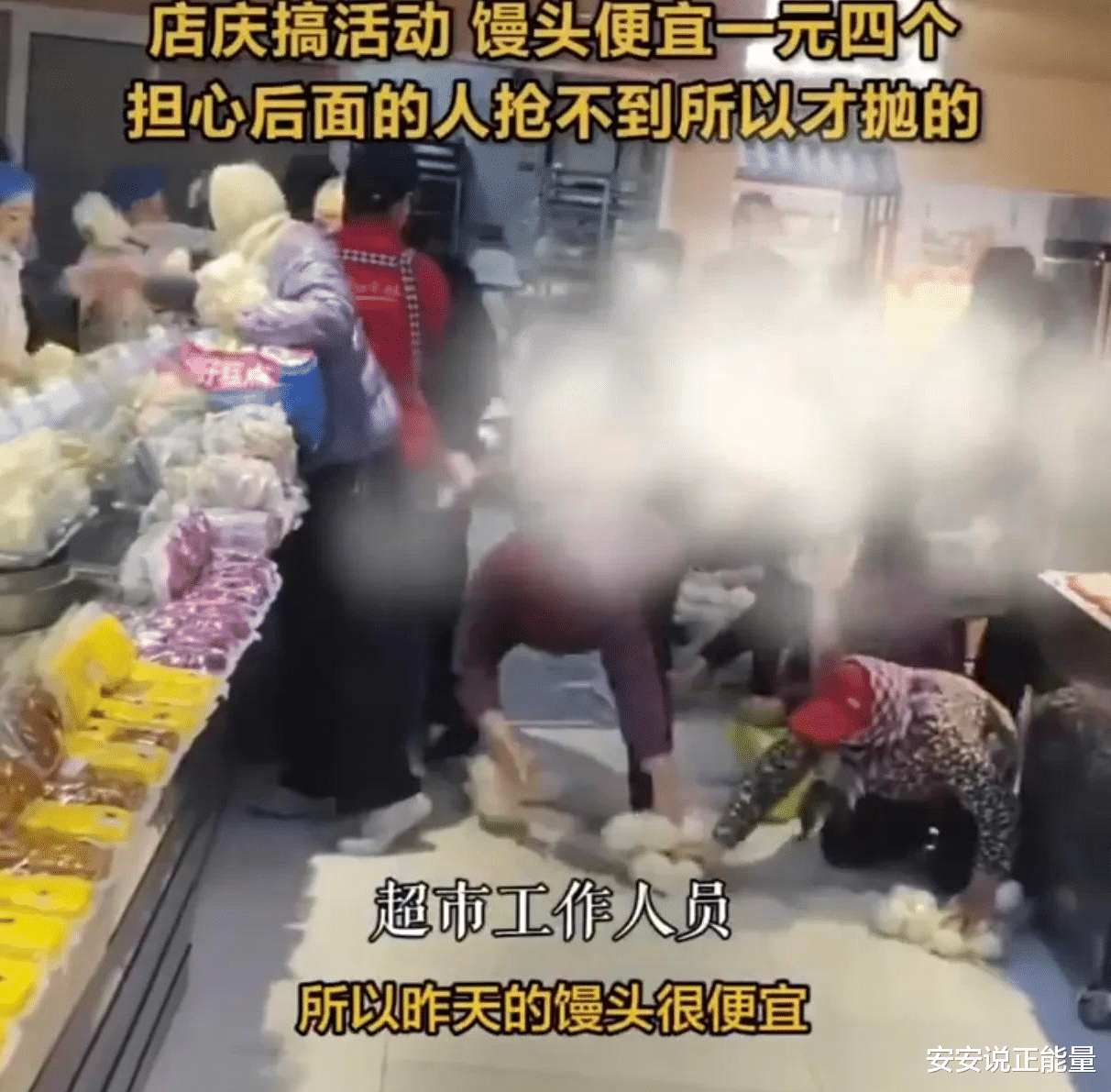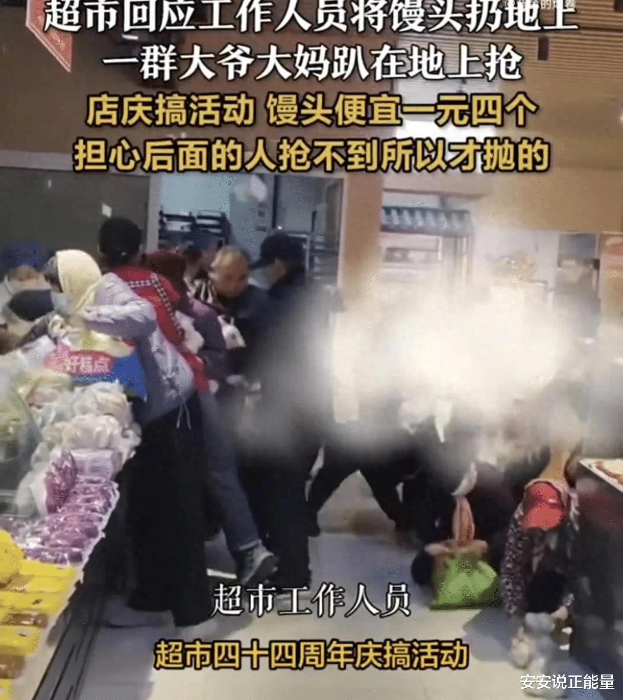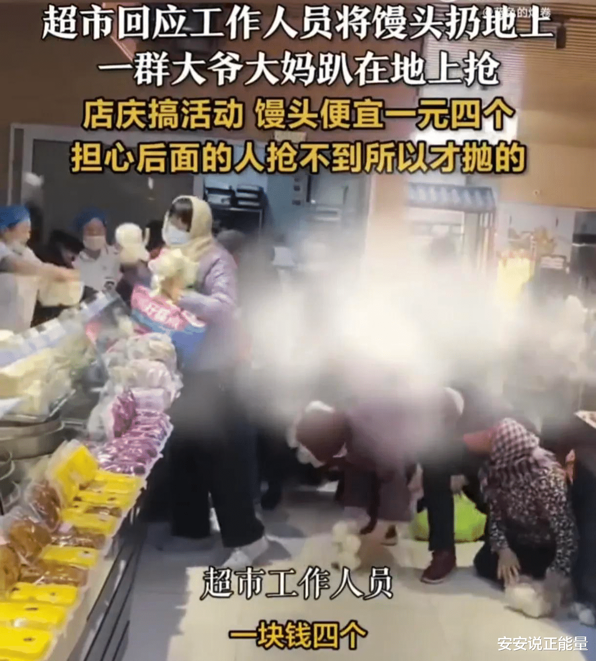 视频在网上引发热议后,超市工作人员表示,工作人员不是故意扔馒头到地上给老人抢,主要是因为当天是超市四十四周年店庆,馒头搞店庆价,一块钱可以买四个馒头。