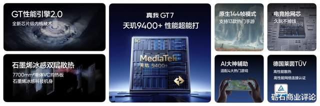 真我GT7首批搭载最新3nm旗舰芯天玑9400+,CPU性能较上代提升28.5%,能效提升31%;GPU性能相比上代提升8%,能效提升10%。