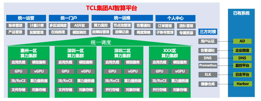 AI Infra应用需求结合业务推进中的实际痛点与长期发展规划,TCL明确提出对AI Infra的四大核心需求,以改变当前基础设施支撑能力不足的问题:一是构建跨部门协同的算力调度体系,解决多业务线、多算法团队同时争抢GPU资源的协调难题,保障研发与生产任务的高效推进;二是实现算力资源的精细化运营,打破传统物理机独占模式,提升资源利用率,降低闲置资源浪费;三是搭建灵活适配的多场景计算支撑体系,由于AI应用场景不同,存在差异化计算需求,而传统物理机配置流程复杂,难以实现简化机器配置流程,难以快速响应与适配;四是建立标准化的跨地域运维体系,降低多区域运营维护成本,提升基础设施的整体稳定性与可扩展性。