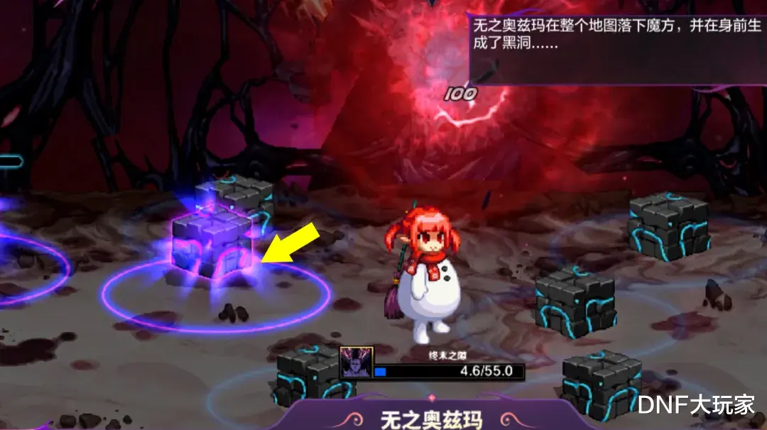 Boss召唤很多“小方块”,其中有一些是“紫色”的,我们需要第一时间打掉所有的“紫色小方块”,这个机制时长28秒,时间到了后,Boss破防,可疯狂输出直接带走。