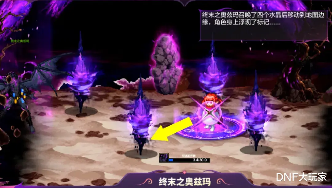 Boss无敌,场地出现4个“紫色柱子”,Boss召唤“紫色光圈”随机锁定1个玩家,然后冲撞玩家。