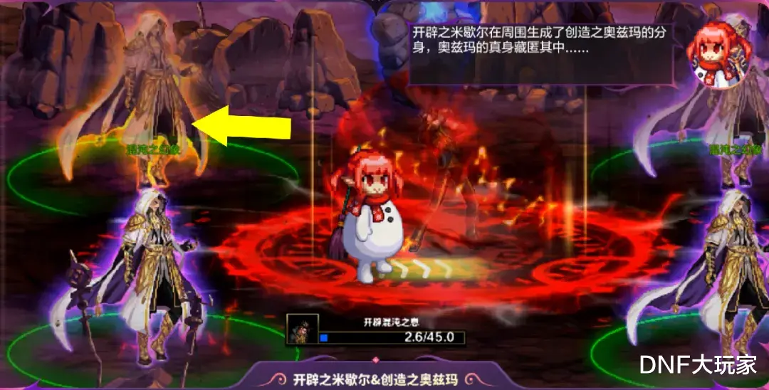 Boss在地图中间,处于无敌状态,在四周召唤4个分身,1真3假,发“金光”的才是真身,有一定血量,需要在规定时间内用技能打掉真分身,此机制一共3轮。成功完成3次真假分身后,Boss进入破防状态,持续15秒,疯狂输出吧!