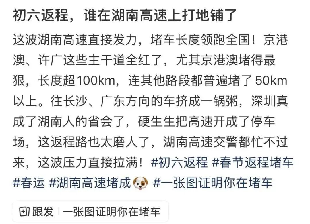 春运返程期间,多地高速路段发生长时间拥堵,甚至有高速路段拥堵长度一度超100km,网友纷纷吐槽感受了一次“时间倒流”:出发时预计10小时,开了9个小时后,还剩下11小时。网友“Smile”分享她的经历称,从邵阳武冈到长沙,平时车程大约为3.5个小时,这次她早上9点从家出发,一直到下午3点多还在邵阳,最后凌晨1点才到达长沙。
