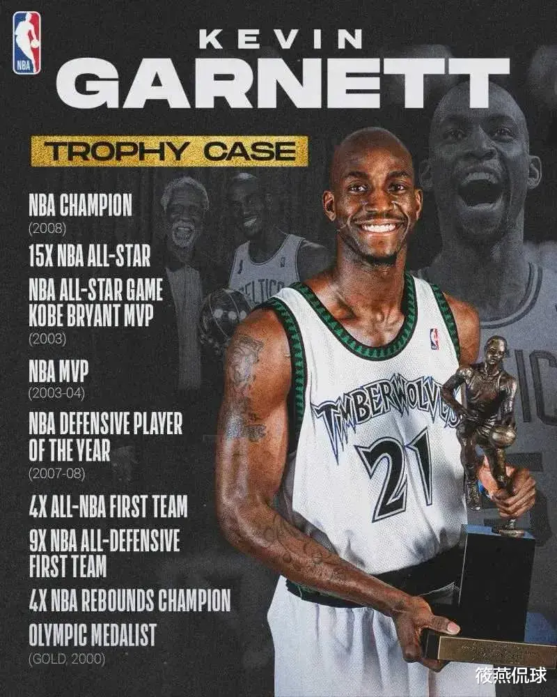 加内特于1995年的首轮第5顺位被森林狼选中至2016年宣布退役,长达21年的NBA生涯中,常规赛场均能贡献17.8分10板3.7助1.3断1.4帽,季后赛则能场均砍下18.2分10.7板3.3助1.2断1.3帽,是当时全能前锋的代表性人物。