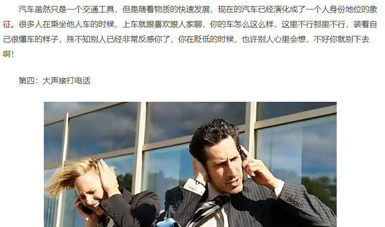 车上接打电话是一件非常普遍的事情,但是一定要注意形象和言谈举止,很多人在车上接打电话鼓吹自己有多么多么厉害,还故意把声音提的很高,生怕旁边的人不知道他有这么多项目在做。让人觉得反感,也可笑。
