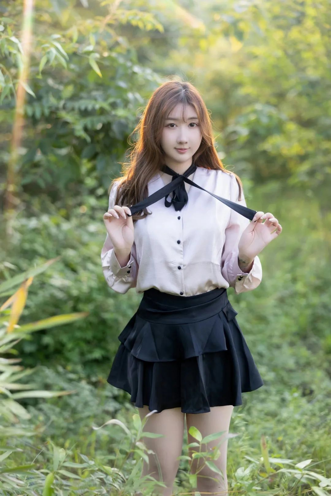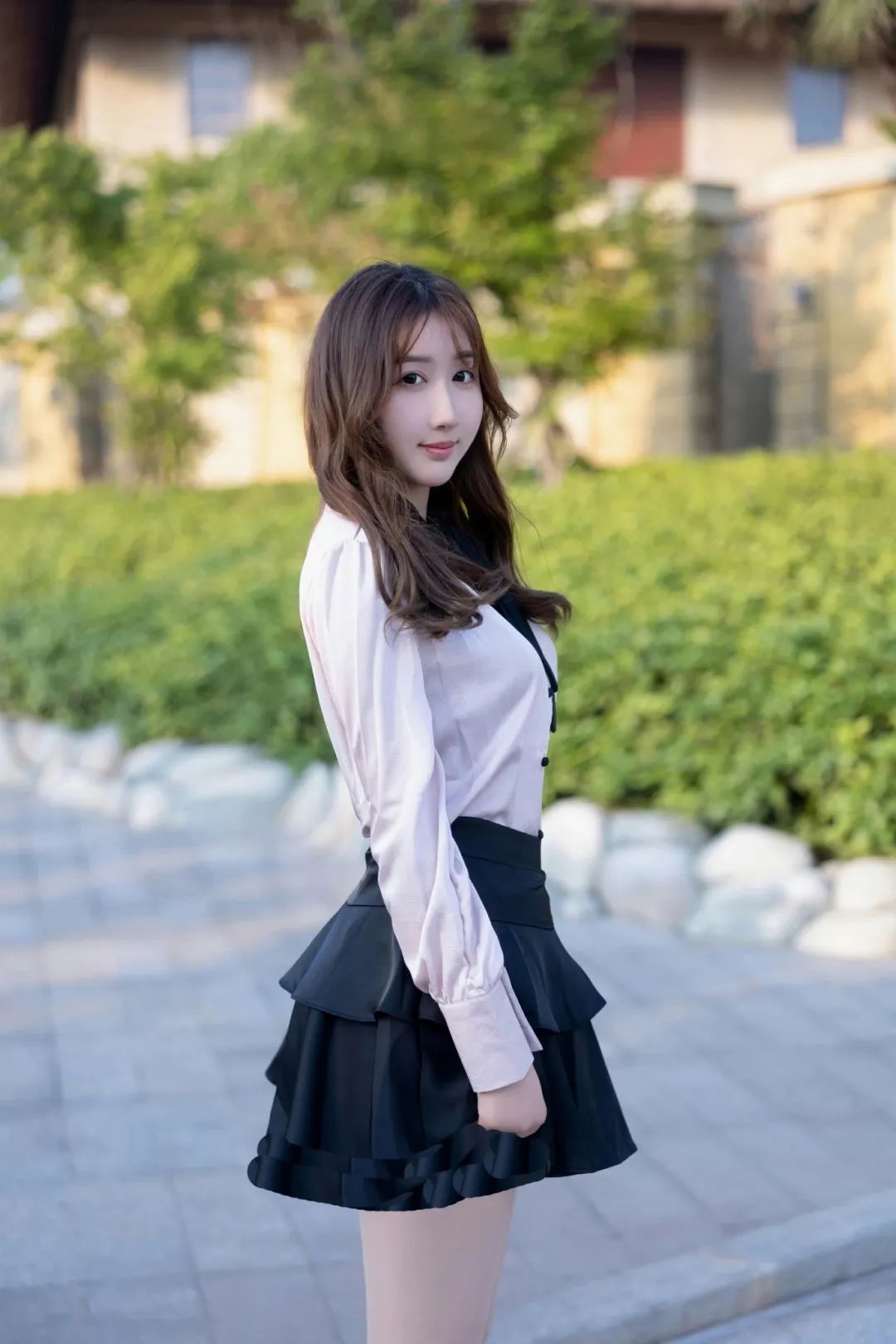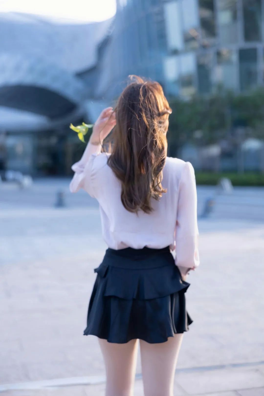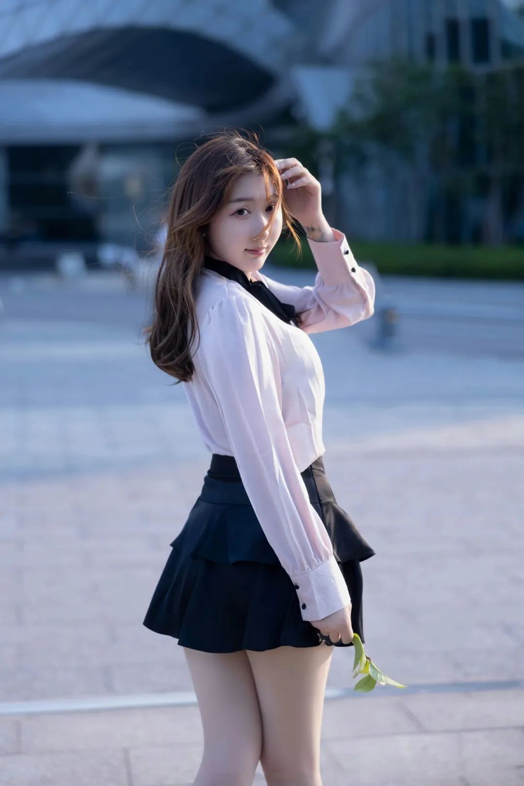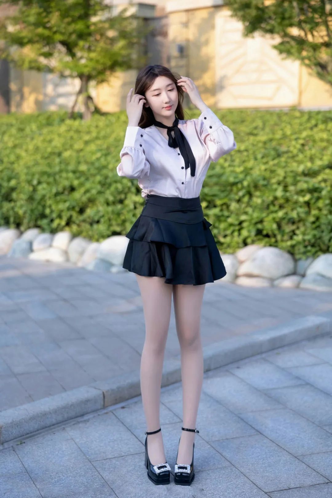 粉白长袖衫轻拂风, 黑色扣子点缀妩媚容。短裙褶皱如潮汐舞, 肉色丝袜透着温柔。