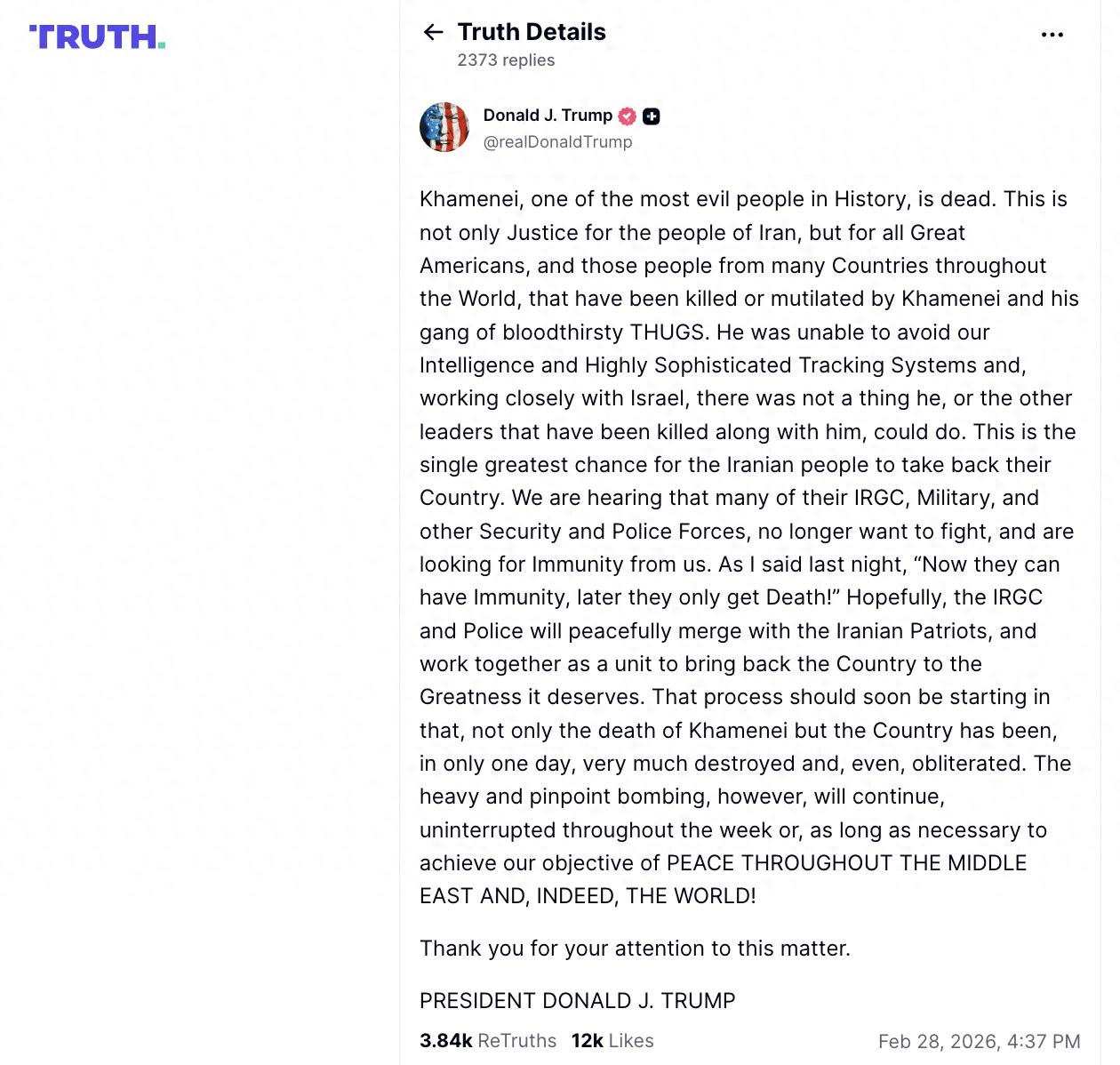 美国时间2月28日4点37分,特朗普在社交平台Truth Social上写道:“哈梅内伊,历史上最邪恶的人之一,已经离世。”