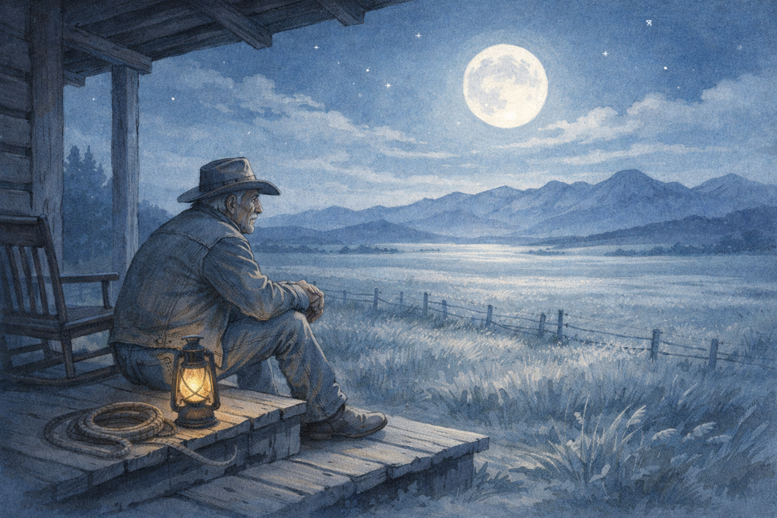 那天晚上, 约翰一个人坐在门廊上面,他想起他爸爸临终之前,抓着他的手说,「儿子,照看好这片土地,它会照看好你的孩子」