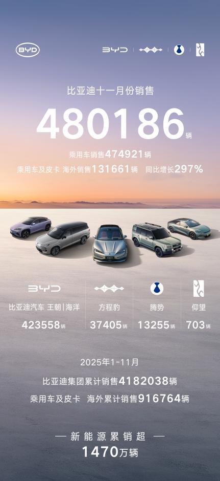 从整体数据来看,比亚迪11月全集团销量达到480186辆,其中乘用车贡献了474921辆,再次刷新了2025年以来的单月销量高点。这不仅意味着比亚迪在国内市场保持了强劲的势头,也反映出其在产品布局与市场响应上的持续竞争力。值得关注的是,今年1月至11月,比亚迪累计销量已突破418万辆,同比增长11.3%,这一数字也基本锁定了比亚迪作为2025年度中国汽车市场销量冠军的地位。