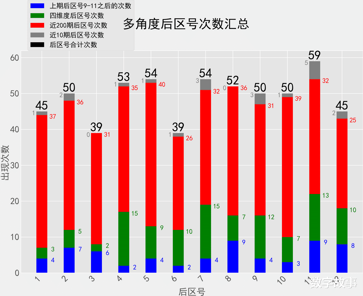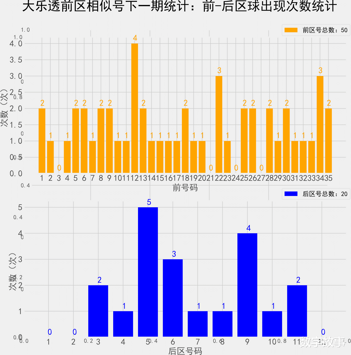 大乐透近10期前后区号统计情况统计样本数据: 50个前区号码 20个后区号码