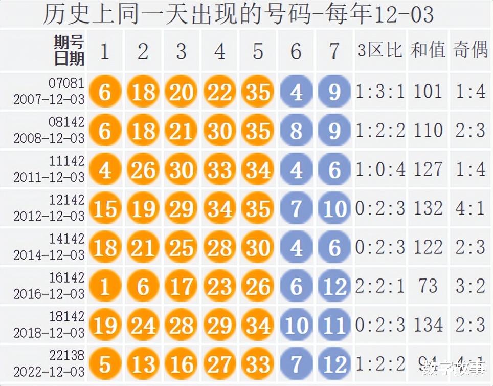 博弈心理,挑战概率: 看近期开奖号码,也可看历史数据统计!【大乐透25138期多角度冷热号】大乐透25138期四维走势图,前后区号统计及冷热号1) 历史同一天:12月03日 (共8期)