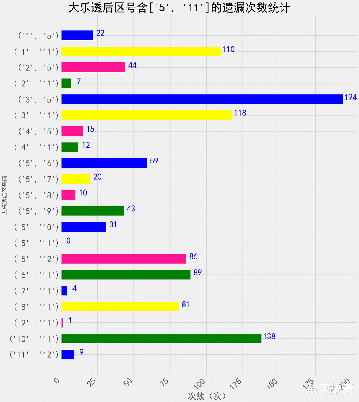 大乐透后区含5或11的双号遗漏次数统计大乐透后区组合5-11近150期出了6次,这次中断了48期遗漏。