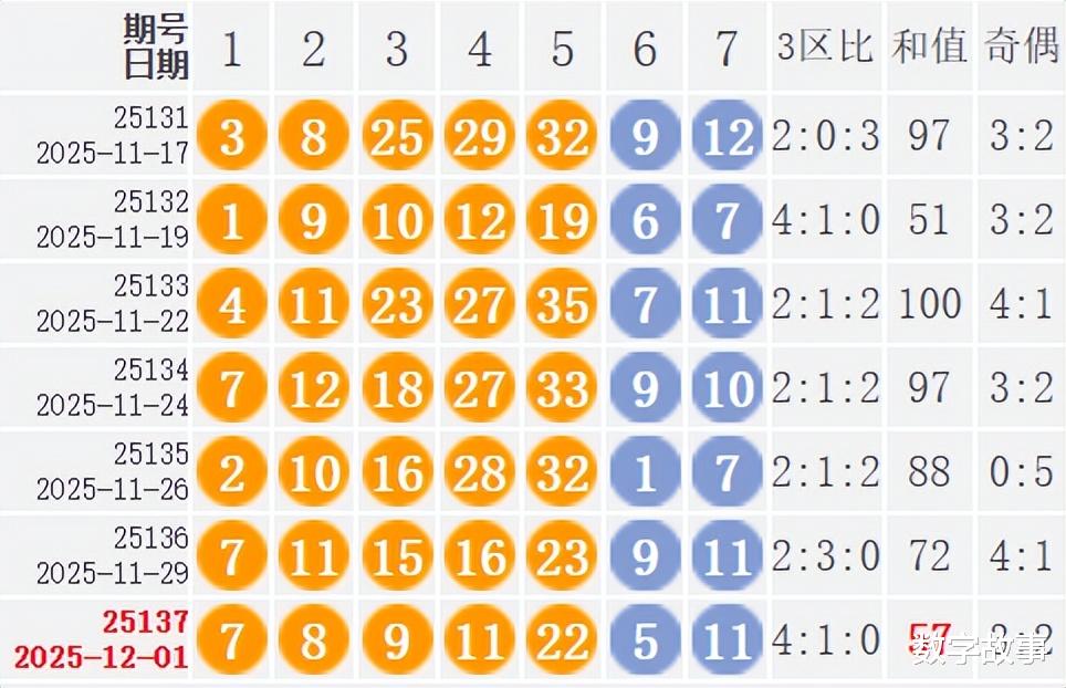 大乐透25137期开奖结果及中奖情况:出奖时间: 2025-12-01 星期一 前区号:7-8-9-11-22后区号:5-11大乐透前区重号叠码:7, 11后区重号叠码:11前区奇偶比:3:2 前区和值:57前区跨度:15 三区比:4:1:0连号: 7-8-9