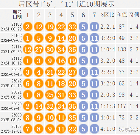 =>大乐透近1500期后区号5-11之后的冷热号后区热号:11,8,12,2后区冷号:4,6,10