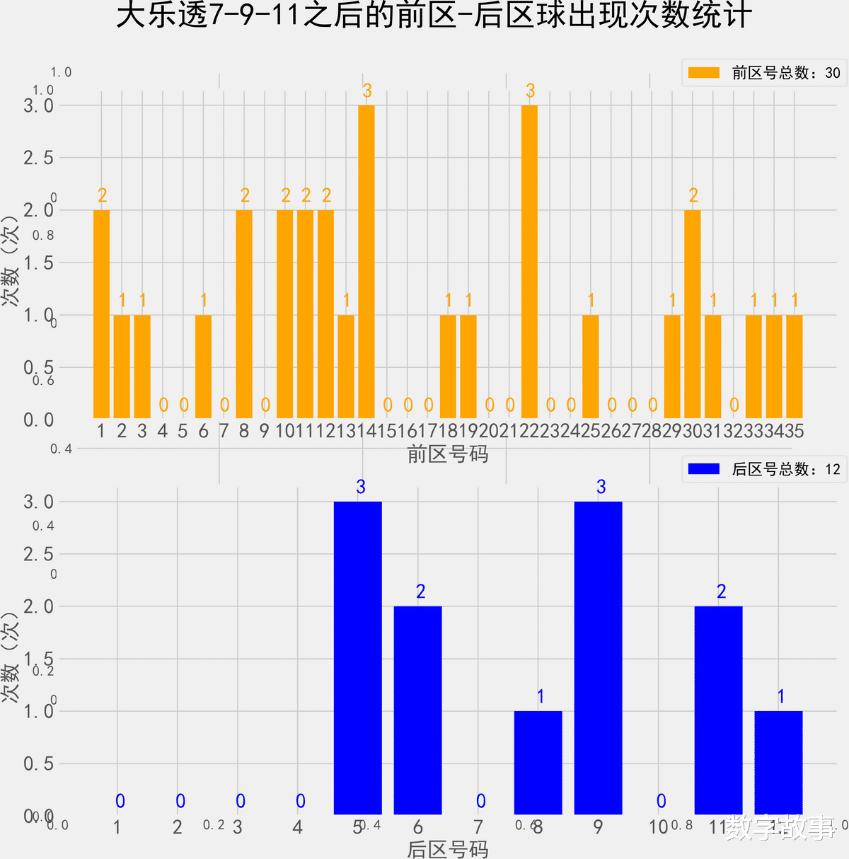大乐透近200期前后区号统计情况统计样本数据: 1000个前区号码 400个后区号码