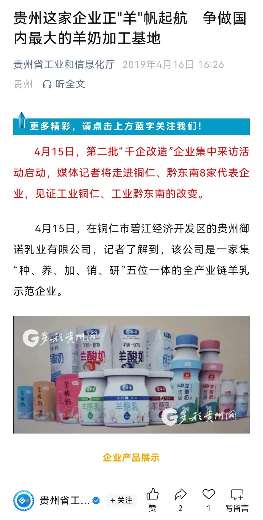 贵州本地媒体2019年对御诺乳业的宣传报道