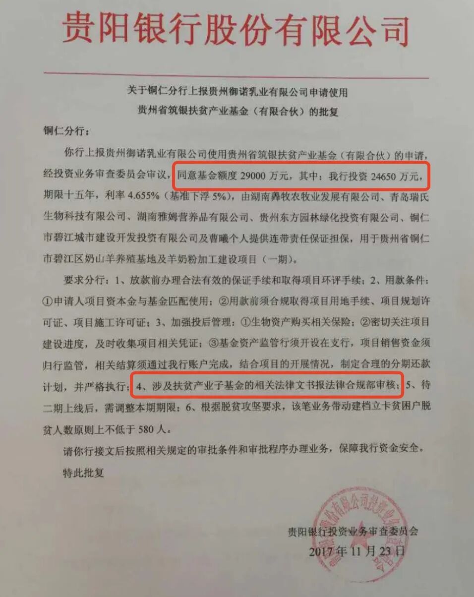 资料显示,2017年,贵州省筑银扶贫产业基金(有限合伙)、铜仁市国有资产投资有限公司(下称铜仁国资公司)分别委托贵阳银行铜仁分行,向御诺乳业发放了两笔共计2.9亿元的贷款,为期15年。