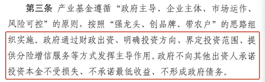 事实上,《贵州脱贫攻坚投资基金产业子基金管理办法(试行)》第三条明确规定,政府通过财政出资、明确投资方向、界定投资范围、提供风险增信服务等方式发挥主导作用;政府不向其他出资人承诺投资本金不受损失、不承诺最低收益、不形成政府债务。