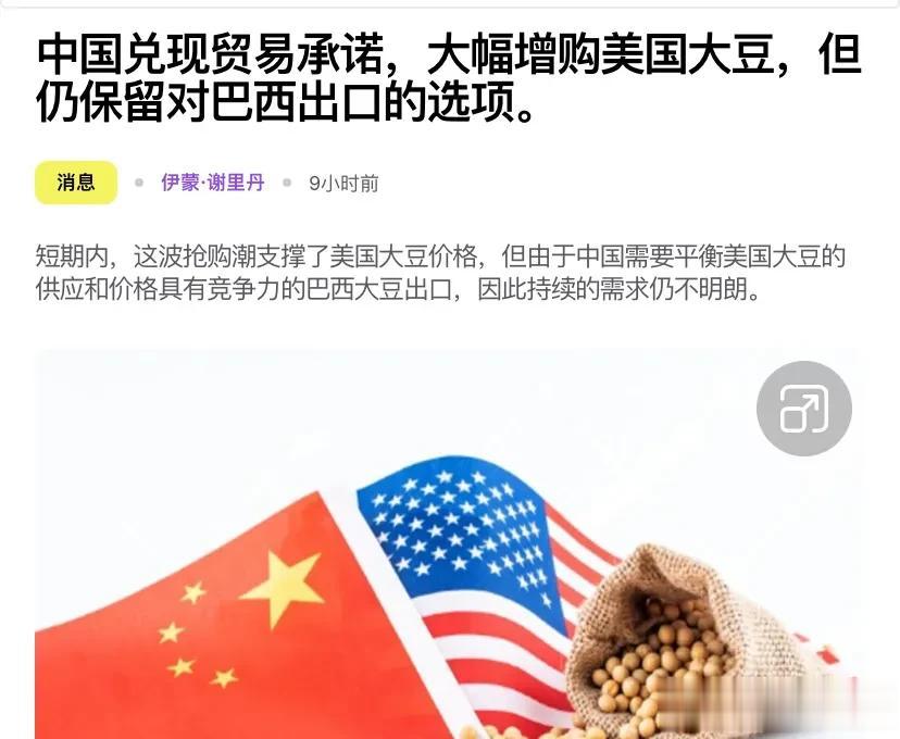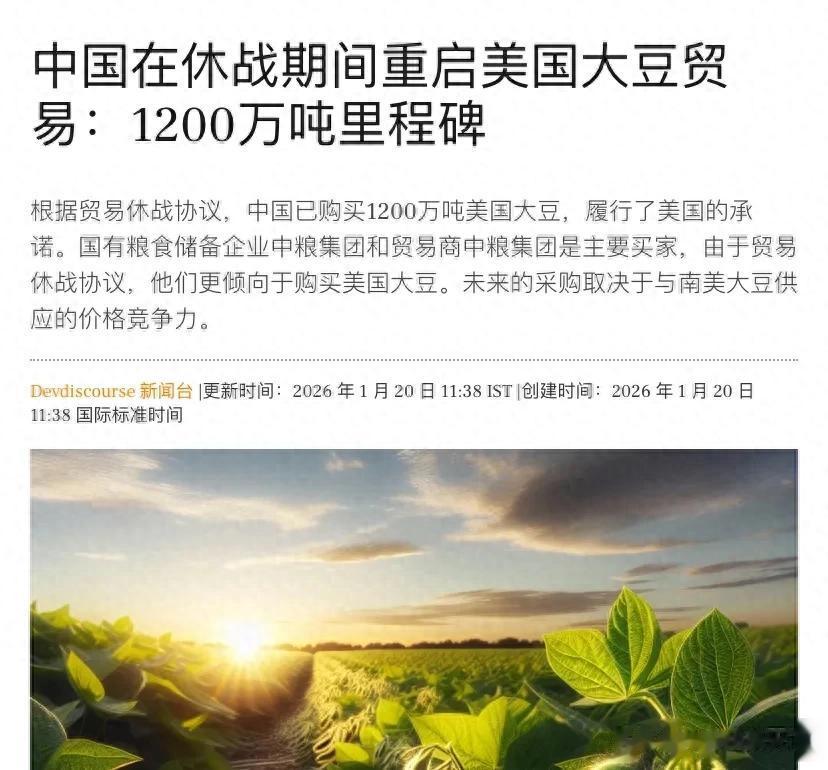 1月20日媒体报道,按照约定,在2026年2月底之前,中国已购买了1200万吨美国大豆,履行了对美国的承诺。