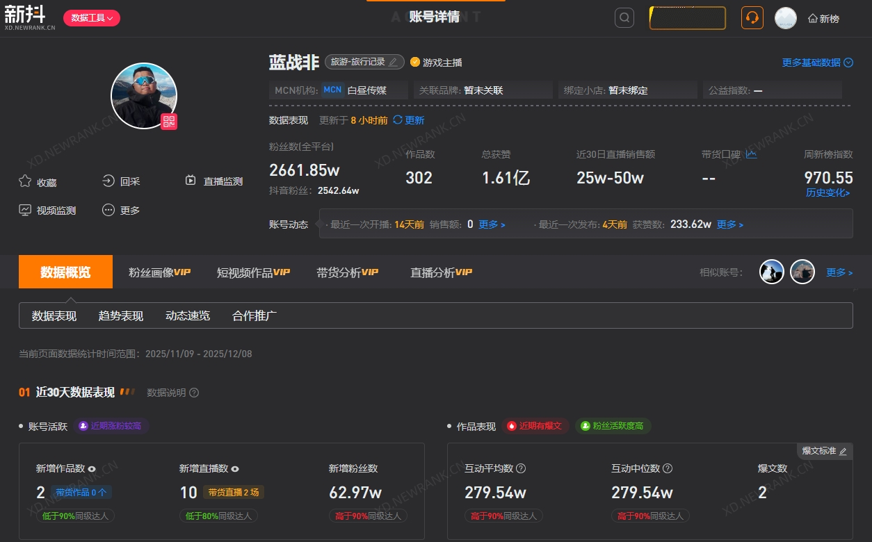 第三方数据显示,蓝战非某视频平台近30日涨粉63万,商业化水平显示其1-20s、21-60s、60s以上视频广告报价均为150万。