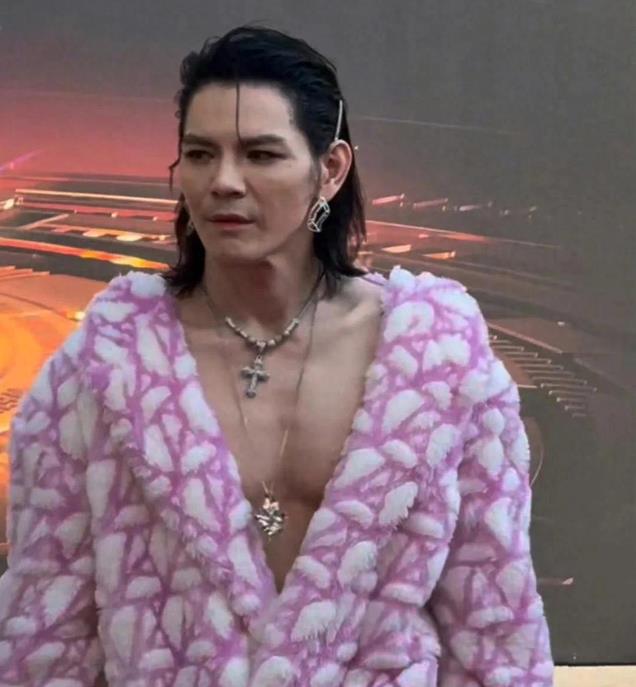 向佐穿了一件粉色的毛绒大衣,硕大的V字领下,向佐的胸肌隐隐若现。