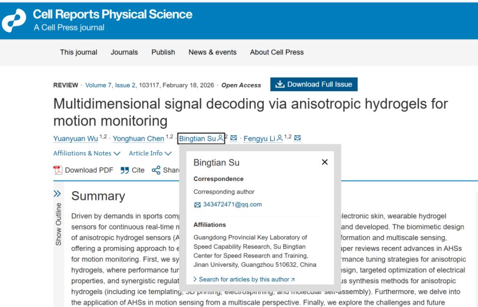 苏炳添截止目前可查的7篇公开论文,前四篇发表在国内专业期刊,2025年迄今的三篇发表于国际期刊。最新这篇论文发表在《Cell Reports Physical Science》,这是Cell Press(Elsevier旗下顶级品牌)子刊,2024-2025 Impact Factor约为7.3,CiteScore 12.0,属于物理/材料/交叉科学领域的Q1高水平期刊,在国际学术界认可度很高。这是一篇综述性论文,核心围绕“各向异性水凝胶传感器(AHS)”在运动监测中的多维信号解码。是材料科学服务竞技体育的典范,直接助力“体教融合”与“科技奥运”。