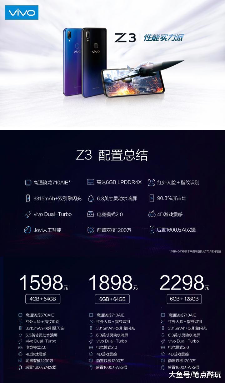 【骁龙710 AIE+双涡轮+双引擎闪充!vivo Z3发布】以“性能实力派”为名,vivo Z3搭载性能强劲的骁龙710 AIE处理器,“双涡轮”vivo Dual-Turbo技术和新一代红外人脸指纹识别加持,3315mAh大电池+“双引擎闪充”保持持久续航,此外90.3%屏占比的水滴屏带来养眼视觉观感,加上仅1598元起步的售价,10月17日发布后,无疑将会成为下半年更能打的爆款机型。