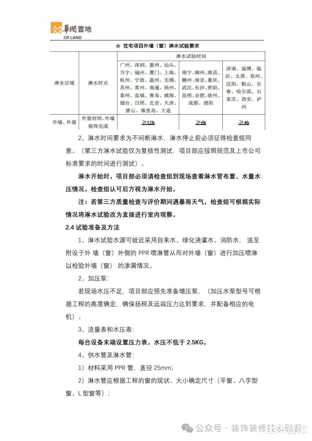 为有效防治住宅工程外窗(墙)的渗漏常见质量问题,确保新建住宅工程外窗(墙)防水工程施工质量,提升我市住宅工程质量品质,在总结全市各地经验的基础上,借鉴先进做法,编制本指引。我市新建、扩建、改建的住宅工程(含商品住宅工程和保障性安居工程),在分户验收前按本指引进行外窗(墙)淋水试验。公共建筑可参考本指引执行。建筑外窗淋水部位主要包括窗扇与窗框之间的开启缝、窗框之间的拼接缝、拼樘框与窗外框的拼缝以及窗与窗洞的安装缝等容易出现渗漏的部位。建筑外墙淋水部位主要包括外墙墙板交接处、设备平台、雨蓬、外墙脚手架洞口、墙面变形缝(分格缝)、伸出外墙管道、女儿墙压顶、外墙预埋件、装饰线条等容易出现渗漏的部位。外窗(墙)淋水试验应在住宅分户验收前进行,可以由建设单位委托第三方检测机构实施,由第三方检测机构对每个单位工程出具淋水试验报告。外窗(墙)淋水试验前,淋水试验单位应编制专项试验方案,外窗(墙)淋水试验技术要求不得低于本文件要求,专项试验方案应经建设、施工、监理单位共同确认后实施。监理单位对外窗(墙)淋水试验应进行现场全过程监督,重点检查喷淋装置、水压、流量、淋水时间等,发现问题及时督促责任单位进行整改,对拒不整改或整改不到位的,应及时向工程所在地建设工程质量监督机构报告。外窗(墙)淋水试验不合格或未进行淋水试验的不得通过分户验收。淋水试验不合格的,经整改后应对该单位工程重新进行淋水试验,出具淋水试验报告。(一)外窗淋水试验1. 装置包括控制阀、压力表、喷水孔和直径19mm水管等,淋水试验淋水量应控制在3L/㎡.min以上,被检区以形成连续水幕为准。2. 淋水试验的喷水方向与水平方向角度宜30度,喷射压力不应低于0.16MPa,喷水孔距窗表面、上口距离宜为100~150mm,喷射时间不少于1小时。3. 淋水立面从上往下,住宅每3层随机挑选1层(有挑檐的每1层)设置一条横向淋水区,淋水同时观察、记录淋水带范围内外窗及周边室内渗漏情况。(二)外墙淋水试验1. 装置包括控制阀、压力表、增强泵、喷水孔和淋水管线等。淋水管线内径宜为(20±5)mm,管线上淋水孔的直径宜为3mm,孔距宜为180~220mm,离墙距离不应大于150mm,喷水孔淋水量应控制在3L/㎡.min以上,被检区以形成连续水幕为准。2. 喷水孔方向与水平方向角度宜30度,喷射压力不应低于0.3MPa,喷水孔距墙表面距离宜为100~150mm,喷射时间不少于1小时。3. 淋水立面从上往下,住宅每3层(有挑檐的每1层)设置一条横向淋水区,淋水同时观察并记录淋水带范围内外墙室内渗漏情况,对怀疑有渗漏的部位可以加强淋水。五、其它要求1. 外窗(墙)淋水试验实施前,建设单位应将淋水试验方案报当地建设工程质量监督机构并在淋水试验前3个工作日书面通知监督机构。各地监督机构应将淋水试验作为住宅工程质量控制的关键点进行到场监督,监督检查淋水试验是否满足本工作指引要求,在监督项目分户验收时抽查每个单位工程淋水试验报告。2. 淋水区采用的喷淋装置应能控制流量、压力及时间,喷淋水压、流量能持续保持稳定,宜具备水压、流量、时间记录功能。3. 淋水试验单位应对淋水试验过程进行影像留存,监理单位现场监督影像留存的完整性和真实性。淋水试验每个淋水层至少留存3张照片,包括淋水试验开始、中间、结束三个时间点,也可留存视频资料。照片拍摄应添加水印信息,注明拍摄时间、拍摄地点、楼号。影像留存资料应清晰连续、画面完整,拍摄角度能全面、客观、真实反映现场淋水部位、淋水效果等要素。淋水试验人员、监理人员等应同时反映在影像中。3. 施工单位应收集、整理现场外窗(墙)淋水试验过程影像资料并刻录成光盘,与淋水试验报告作为分户验收的必备资料,随施工技术资料一并归档。本指引自2025年1月1日起实行。附