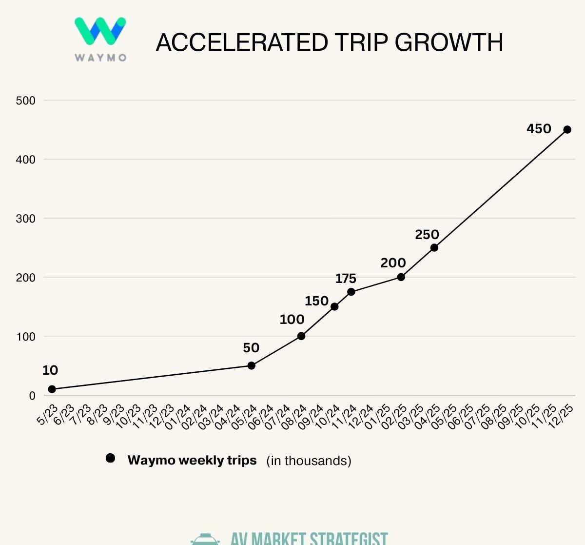 2025年,Waymo 全年完成了1500万次付费出行,是上一年的三倍多。到了2026年初,其周订单量已经稳定在40万次以上。