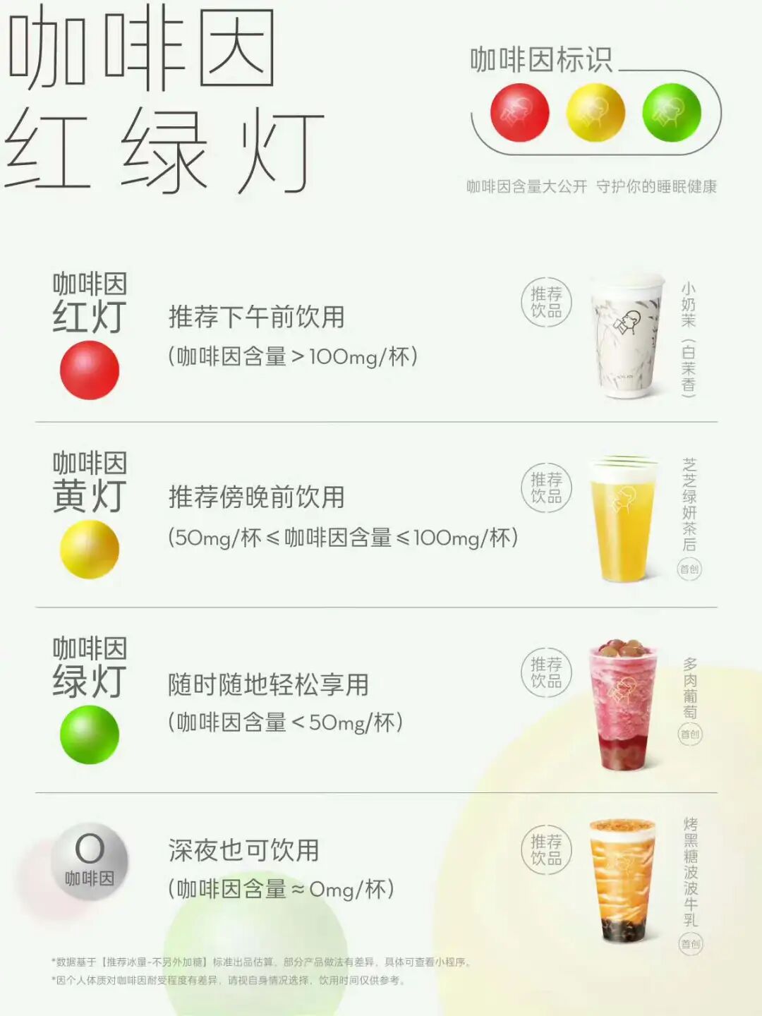 去年8月,喜茶推出“咖啡因红绿灯”标识,为消费者提供饮品咖啡因含量参考。该标识分为四个等级,红灯代表每杯咖啡因含量超100mg,属于高含量区间;黄灯为50mg/杯—100mg/杯;绿灯为每杯不足50mg;还有一类是咖啡因含量近乎为0的无咖啡因饮品。