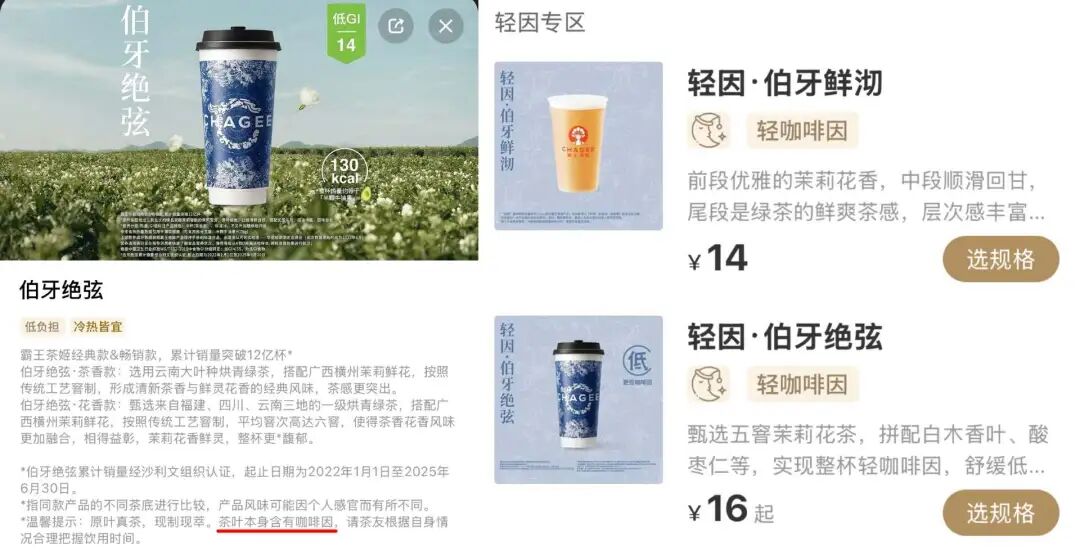 如果在霸王茶姬的小程序点单,还能看到伯牙绝弦、万里木兰等饮品会提示“茶叶本身含有咖啡因,请茶友根据自身情况合理把握饮用时间”。并且品牌还推出了咖啡因含量低于75mg/杯的“轻因”系列,主打低咖啡因体验。