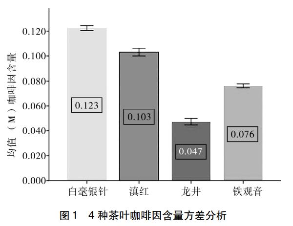 不同品类的茶叶,咖啡因含量也存在明显差异。有研究选取龙井茶、铁观音、滇红茶、白毫银针四种茶叶为样本,采用分光光度法测定其咖啡因含量,结果显示:白毫银针的咖啡因含量最高,杭州龙井最低,铁观音与滇红茶则处于中等水平。